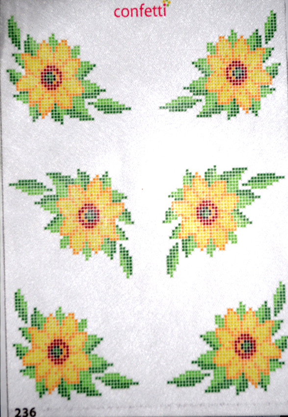 Model „Confetti” este un văl adeziv, solubil în apă. Este o soluție perfectă pentru a broda pe haina preferată, fețe de masă sau perdele. Acest văl, se prinde de țesătură după care se brodeaza și apoi pur și simplu se spală cu apă și flizelinul se descompune și dispare.