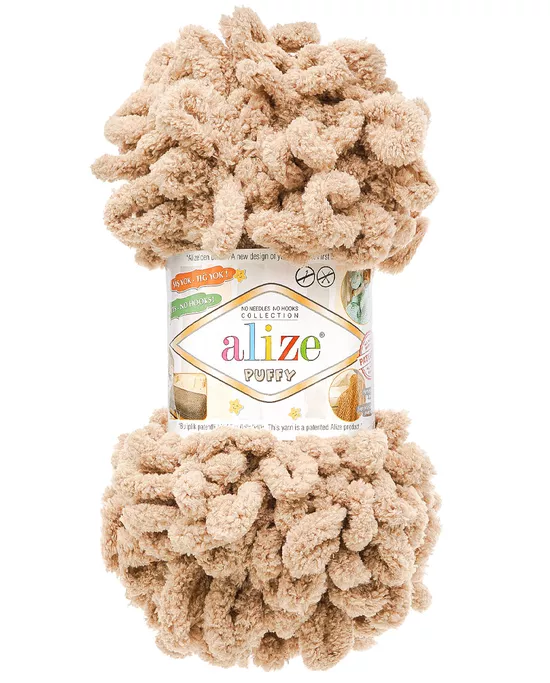 Alize Puffy este un fir unic, cu bucle mari, care se lucrează cu degetele – fără andrele sau croșetă.