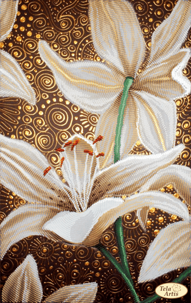 Etichete: auriu, Broderie cu margele, Crini aurii, Flori, Tela artis